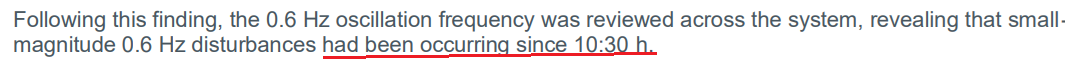 “Following this finding, the 0.6 Hz oscillation frequency was reviewed across the system, revealing that small magnitude 0.6 Hz disturbances had been occurring since 10:30 h. “
