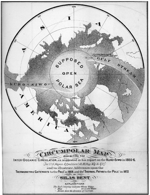 “Silas Bent proposed that the Atlantic Gulf Stream met the warm Pacific Kuroshio current in the Arctic and kept it ice free in 1872 as shown in figure 1″