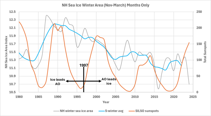 Figure 4 shows the longer-term full-year HadCRUT5 and AMO rising, as NH_ice falls from 1987 to 2024. The very sudden rise in the NH_ice from 1984 to 1987 precedes a strengthening of the Polar Vortex, which begins in 1987, just as the sea ice begins a long decline. Before 1997, NH_ice changes precede AO changes, but after 1997 this relationship reverses, the reason for this change is unclear. Nothing is simple.