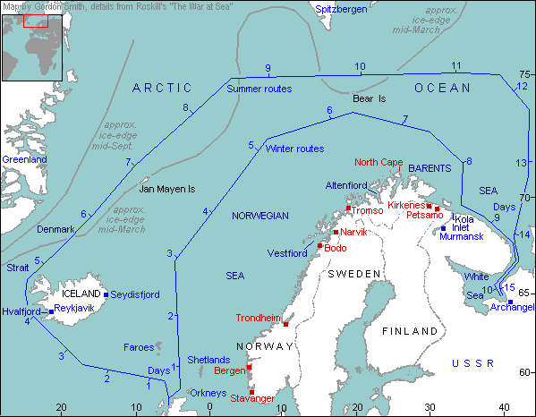 One of my other interests came up with this map of the WW2 Arctic Covoys. Not exactly precise but interesting.