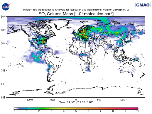 With respect to SO2 concentrations in the atmosphere, they are meaningless. SO2 aerosols are a haze of micron-sized droplets of Sulfuric Acid that reflect the incoming solar radiation, and cool the lower troposphere and the Earth’s surface. The attached image shows the global distribution of SO2 aerosols on Jan 1, 1980