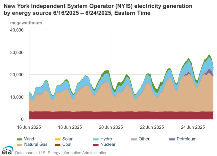 At peak load on Tuesday, 47% of ISO-NE generation came from natural gas, 12% from imports, 13% from nuclear, 12% from petroleum, 1% from coal, and 4% from renewable sources including wind, batteries, and solar. The last remaining coal-fired plant in the region, the Merrimack facility in New Hampshire, supplied 280 MWh on average to the grid on Tuesday. The Merrimack facility is typically only used when demand is high.