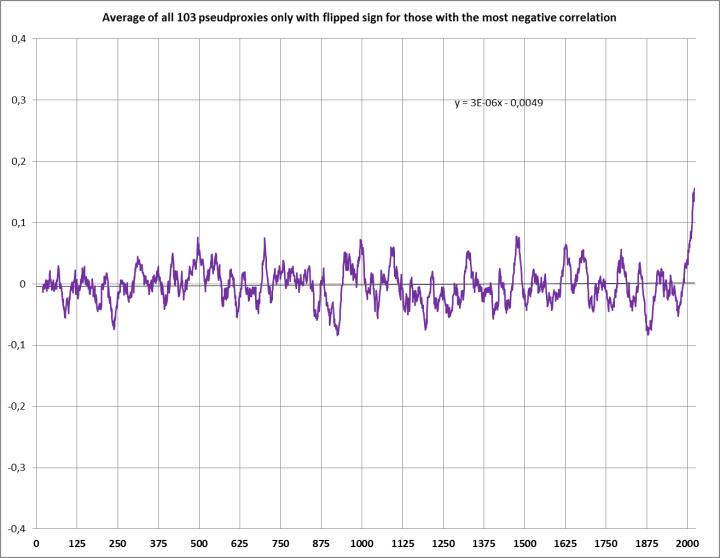 Simply flipping (changing the sign) of the pseudoproxies that have the worst correlation has a similar effect (chart below). That is also allowed in their view, since correlation is correlation and can be used, be it negative or positive.