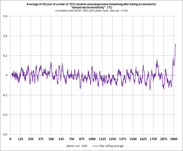 Did my own try on the Mann/Marcott/PAGES2K proxy screening routine and created an ensemble of 103 pseudoproxies consisting of random numbers between -2 and +2 for the time 0-2025 AD. To find the “temperature sensitive” proxies (as prescribed for this process) I tested correlation of the random proxies with the NOAA global temperature data set 1850-2025. The chart below shows what I received as average after discarding the negatively and non-correlating proxies. I created global warming from a bunch of meaningless casino numbers, pure noise.