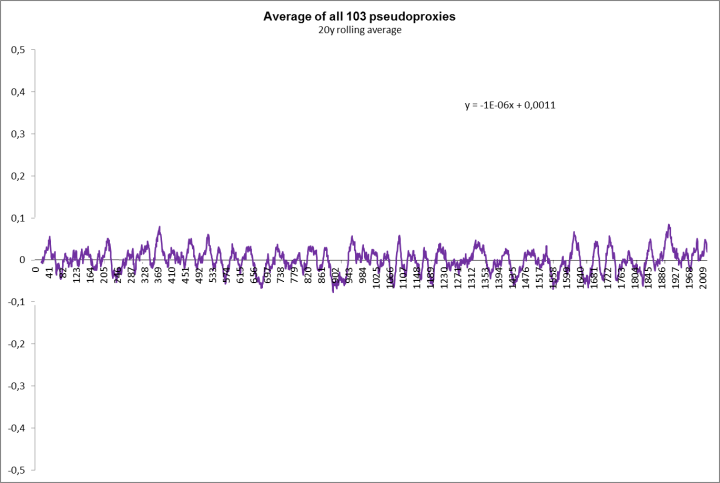 The average of the whole ensemble of pseudoproxies shows no real trend, of course.