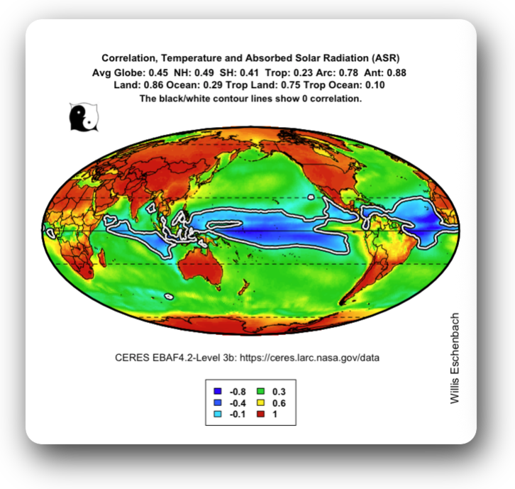 And finally, amazingly, in the areas where the ASR is the highest, as the ASR goes up, the temperature actually goes down. Here a global map showing the correlation between the two. Note the large areas with negative correlation, where increasing ASR leads to lower temperatures. Go figure.
