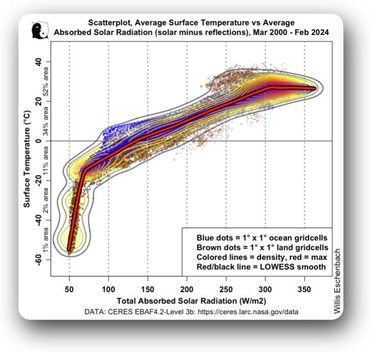 Figure 2. Scatterplot plus density contour lines and LOWESS smooth. Top of atmosphere radiative imbalance versus surface temperature, entire planet. The percentage (% area) numbers show the percentage of the surface area in each temperature interval.