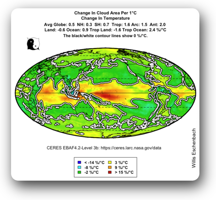 I’m sorry, but that claim doesn’t pass the laugh test. Here is the change in cloud area versus temperature by gridcell.