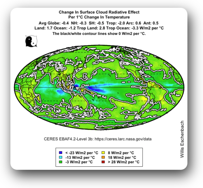 You got it, Cloud cooling would increase, obviously. I am using the time-averaged effect to infer the “effect of cloud changes resulting from surface temperature changes”. The trend of the LOWESS line shows exactly that.