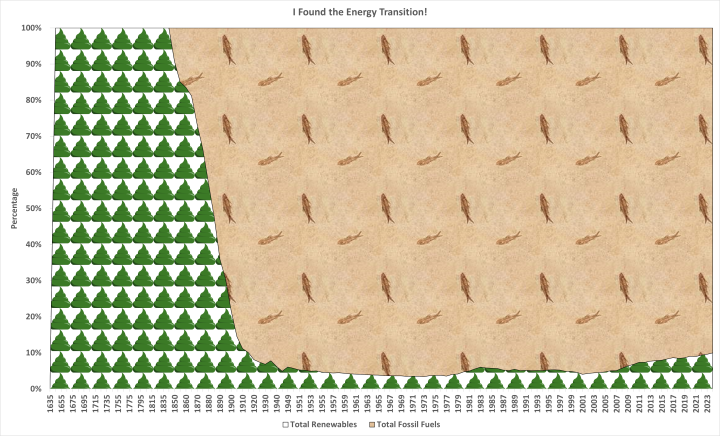 To the extent that there has been an energy transition, it was from renewables to fossil fuels. It occurred very rapidly from 1860 to 1920.