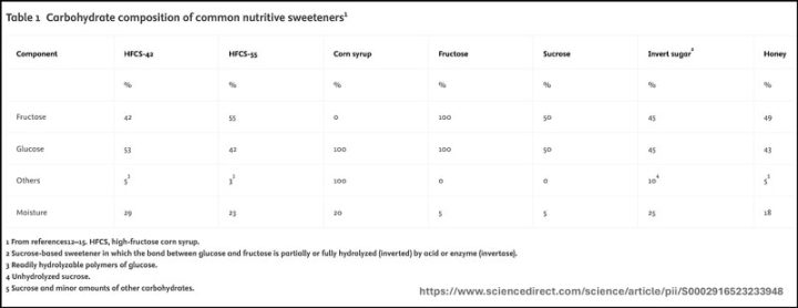 [Note: The ratio of fructose/glucose in HFCS is 42/53 or 55/42, both approximately 50/50. Other sugars make up the remaining 5 and 3 %s. Water is not included in the percentages. ]