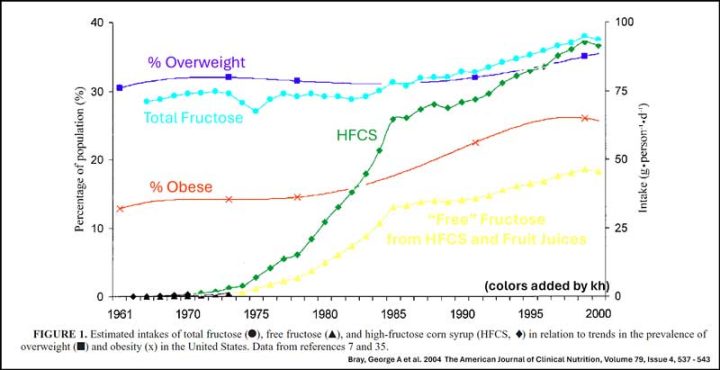 Two other minor (I think) points. First, as you are well aware “they” quietly moved the goalposts a few decades ago by redefining overweight and obese. I don’t see that reflected in Bray’s chart and I can’t think why it would not show up there. Makes me wonder about the rest of his data, Second, One reason other than cost for using HFCS in food instead of sugar is that Fructose is significantly sweeter than Sucrose.