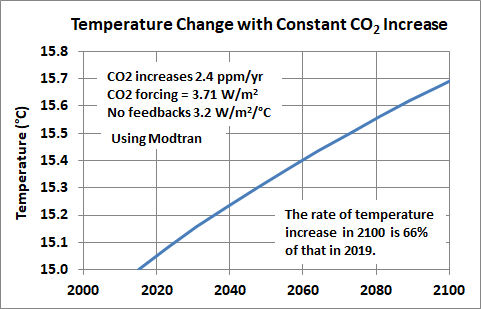 It shows that with a constant CO2 increase of 2.4 ppm/yr, which is the current rate, the rate of temperature change per year in 2100 is 66% of that in 2016. Climate models and Modtran take into account the CO2 logarithmic saturation effect. That effect is small over the time frame of interest to 2100.