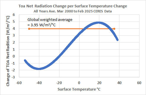 I can complete the analysis by adding the difference in the TOA imbalance-temperature relation between the warm and cold years group, which accounts for temperature caused air circulation changes, to the rate of imbalance change implied by the relationship of local imbalance to surface temperature of the 25-year analysis. The 25-year analysis gives an ECS of 1.14 C with a global average imbalance relationship of 3.95 W/m2 per °C. However, the imbalance difference between warm and cold years is -0.13 W/m2/°C with a temperature difference of 0.68 °C, equating to -0.19 W/m2/°C for a 1 degree temperature difference. Combining these gives 3.95 – 0.19 = 3.76 W/m2/°C. This give a slowTCR of 3.71/3.76 = 0.983 °C. My I-D model shows that is equivalent to an ECS of 1.20 °C. I don’t know how the recent reduction in aerosols (China cleaning up aerosols from its coal-fired plants and clearer fuel used in shipping) and the 10% increase of water vapour in the stratosphere due to the Hunga Tonga-Hunga Ha’apai volcanic eruption would affect this result.