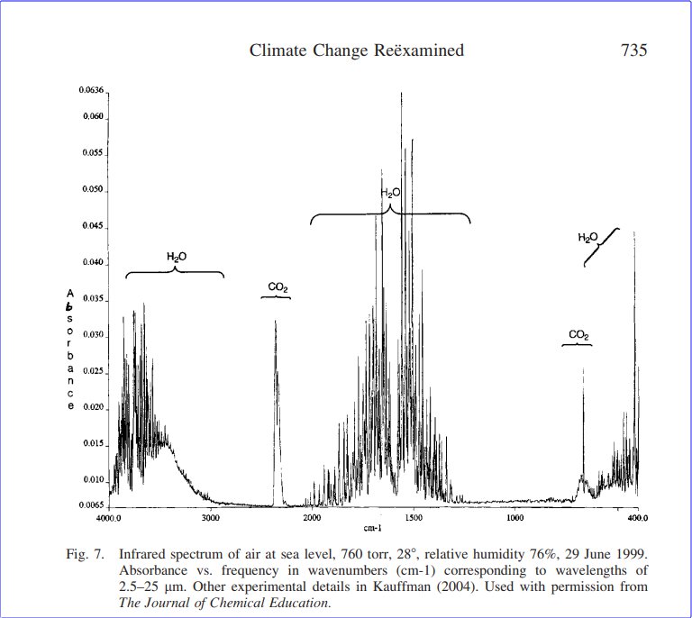 Shown in Fig. 7 (See below) is the IR absorption spectrum of a sample of Philadelphia inner city air from 4000 to 400 wavenumbers (wns). There are some additional peaks for H2O down to 200 wns. The gas cell was a 7 cm Al cylinder with KBr windows. In 1999, the concentration of CO2 at the MLO in Hawaii was ca. 370 ppmv (0.73 g CO2/cu. m.).