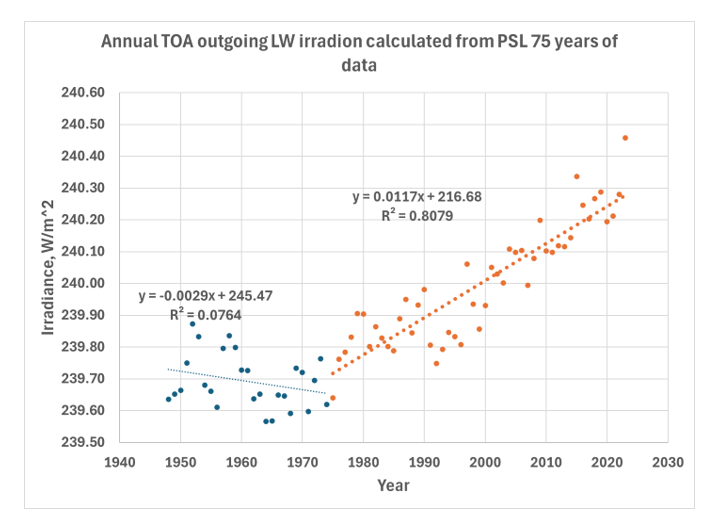 The assumptions of 1 meter surface thickness for both ocean and land and fit to the Dubal 2006 data point resulted in a reasonable 68% area where SST data average data for ocean was taken, land was set at the same 68%. The 75 year plot of the calculated LW outgoing irradiance shows a detectable increase in irradiance after about 1975 and a flat trend from 1948 to 1975, see Figure 2.