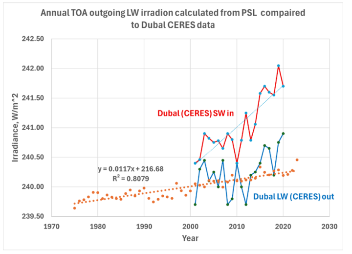 This mathematical exercise was done to see how close calculated irradiance would come to measured irradiance and to prove that climate models using enthalpy instead of radiation or irradiation were valid. (The CRGW (3) model is a enthalpy based model). With the non-ideal PSL data for this task and the assumption this exercise came very close to the measured annual outgoing LW irradiation. This gives some validity to the annual enthalpy correlations to cloud fraction and vapor pressure deficit, VPD. used in the CRGW model.