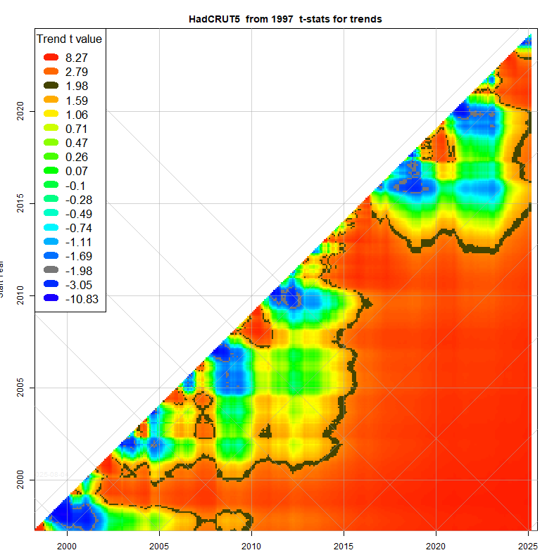 The Version 6.1 global area-averaged linear temperature trend (January 1979 through July 2025) remains at +0.16 deg/ C/decade (+0.22 C/decade over land, +0.13 C/decade over oceans).