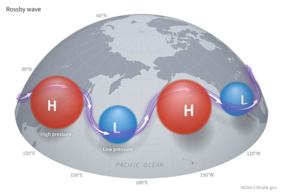 Major teleconnection patterns are large scale Rossby waves that can last for months and sometimes persist around the entire planet. They define the “waviness” of the jet streams and thus the weather in the mid-latitudes, especially in winter. They vary on all time scales, daily, monthly, annually, and decadally. The illustration in figure 1, from climate.gov, shows a Rossby planetary wave. If you’ve read the previous Climate Oscillation posts (see the full list at the bottom of this post) you will recognize how closely related Rossby waves are to the oscillation patterns I have been writing about.