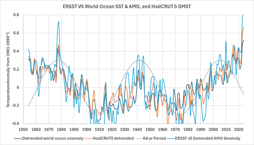 Marcia Wyatt’s “stadium wave” hypothesis shows that a suite of global and regional climate indicators vary over roughly the same 64-year period (Wyatt, 2020), (Wyatt, et al., 2012a), and (Wyatt & Curry, 2014). Although the climate indicators have about the same period, they are offset from one another in time. Using data from the 20th century, the AMO, global SST, and HadCRUT5 have lows in 1904-1911 and 1972-1976.