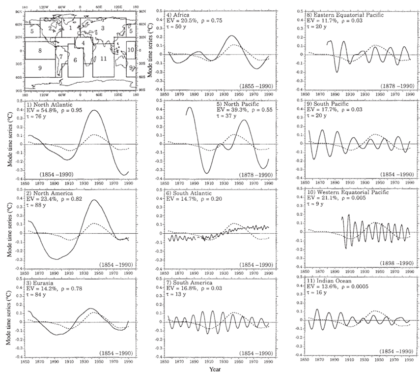 Using singular system analysis, they analyzed temperature data from 11 regions of the earth and found the 65-70 year climate cycle. There are 30 papers in the reference list.
