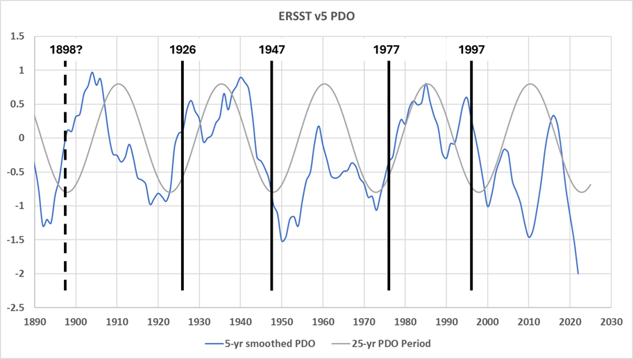 Nathan Mantua and colleagues (Mantua, et al., 1997) identified 20th century “climate shifts” in the PDO in 1925, 1947, and 1977, which results in a major multidecadal climate oscillation of 22 to 30 years. We identified two additional possible PDO shifts in 1898 and 1997 in post 8 of this series. The average difference is around 25 years. A 25-year period is shown with a 5-year-smoothed PDO in figure 4.