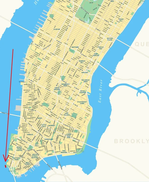 The red arrow has been inserted to be sure that you can find the tiny red mark that indicates the portion of the shoreline represented by Wagner Park. So if the sea level were to rise up, how is that 400 feet of raised land going to prevent the water from coming inland along the rest of the 10 or so miles of waterfront?