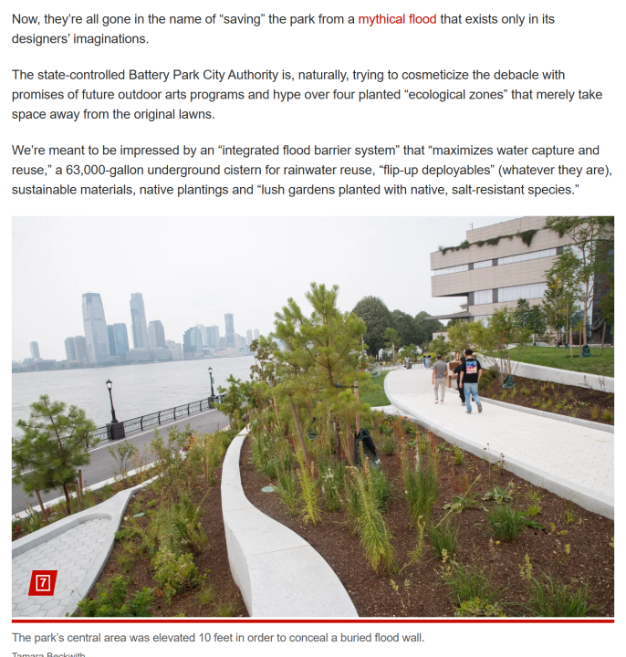 Besides enriching a legion of architects, engineers and landscape designers, the mutant “park” is supposed to protect against a theoretical, worse-than-worst case, one-day-or-someday “100-year” flood caused by rising sea levels. In fact, no such catastrophe has ever occurred. The original park was so securely engineered that Wagner Park suffered no damage whatsoever when superstorm Sandy caused the city’s highest sea level rise ever recorded.