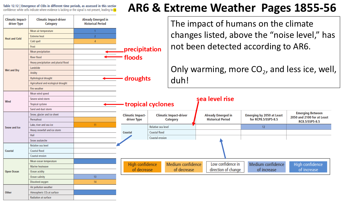 You’re misrepresenting AR6. Page 1856 of WGI is literally Table 12.12, which shows multiple climatic impact-drivers (heat extremes, marine heatwaves, heavy precipitation, etc.) already observed with medium to high confidence. WGI documents the physical hazards; WGII documents the impacts on people and ecosystems. Pretending WG I said ‘no observed risks’ is just cherry-picking scope boundaries.