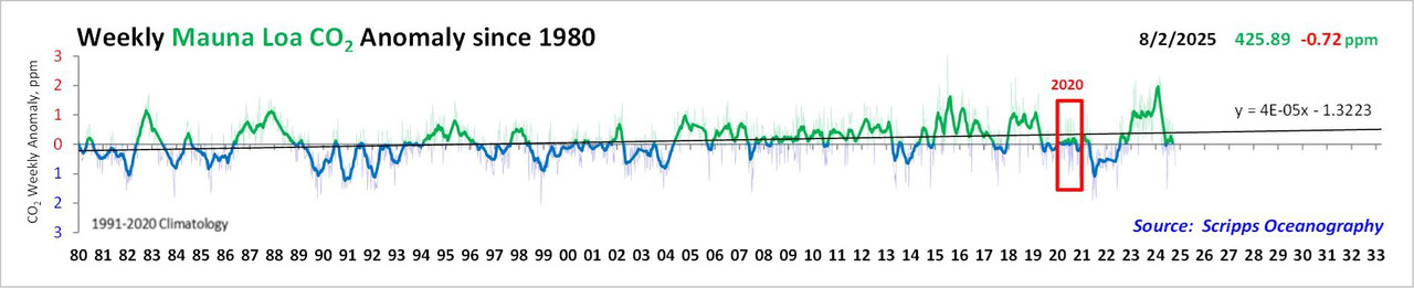 The Readme_072425.pdf document and two of the histograms are also attached to this submission. One final point to directly illustrate the vanishingly weak influence involved in the case of a doubling of CO2 from pre-industrial times: The ~4 W/m^2 increase in the IR absorbing power of the atmosphere in the 2XCO2 case is a fraction of the width of the index mark at “0” on the horizontal axis of these histograms of the hourly values at latitudes 45N and 45S.