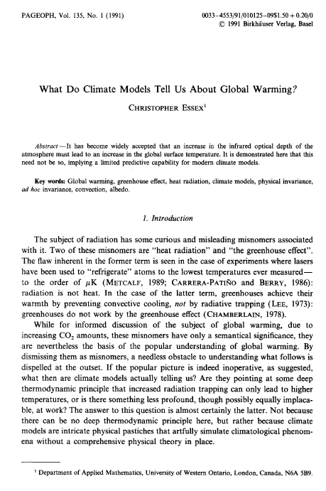 I recently read Christopher Essex’s 1991 paper, “What do climate models tell us about global warming?” first page below.