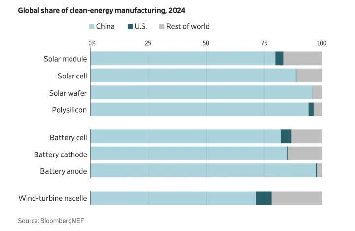 It’s mind-boggling! The Journal provides the following chart (sourced to Bloomberg/NEF) of market shares of various green energy components to illustrate how completely dominant China has become: