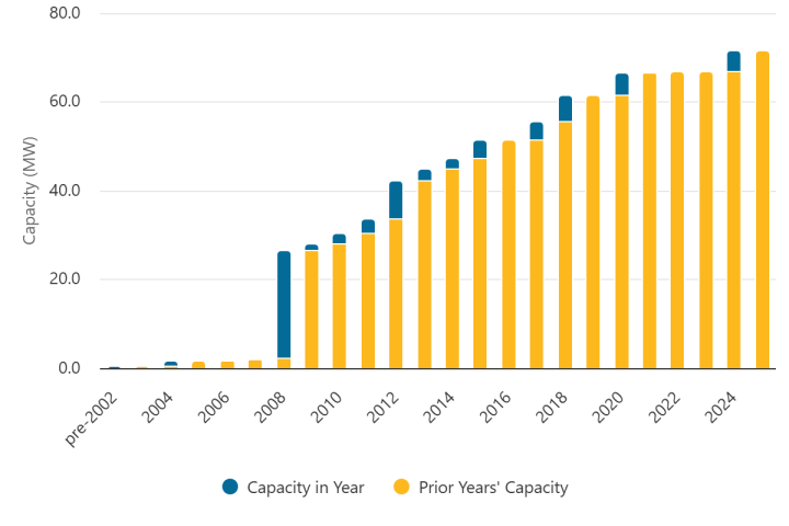 In 2006, California’s wind generation capacity was about 2 MW. It’s now almost 72 MW… Almost 5 doublings.