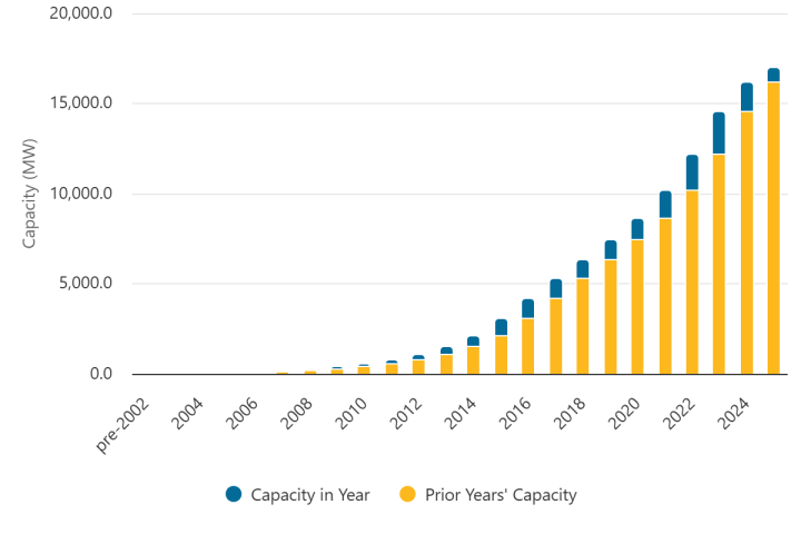 In 2006, California’s total solar generation capacity was 112 MW. It’s now almost 17,000 MW… More than 7 doublings.