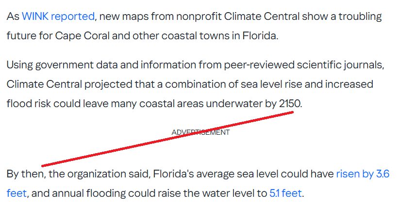 The Cool Down story repeats exaggerated projections from the organization called Climate Central, suggesting that Cape Coral, Florida, will “vanish” under rising seas by 2150. It asserts that Florida’s average sea level could rise 3.6 feet by the end of the century and that 17,000 homes statewide could face annual flooding by 2050. Actual measured sea level data shows this to be impossible.