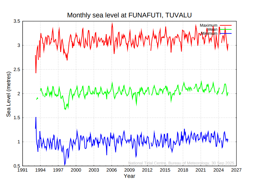 The claim that Tuvalu is “barely one meter above sea level” and faces imminent destruction is a talking point that has been circulating for more than 30 years. Yet, as documented at WUWT in “Remember When the Island of Tuvalu Was Going to Be Inundated by Sea Level Rise? Never Mind.”, Tuvalu remains very much above water. According to the National Oceanic and Atmospheric Administration Tides and Currents website, since the 1980s, SLR near Tuvalu has averaged roughly 3–4 millimeters per year— which is equivalent to a change of 1.29 feet in 100 years —hardly the apocalyptic surge portrayed by Al Jazeera. See the graph below.