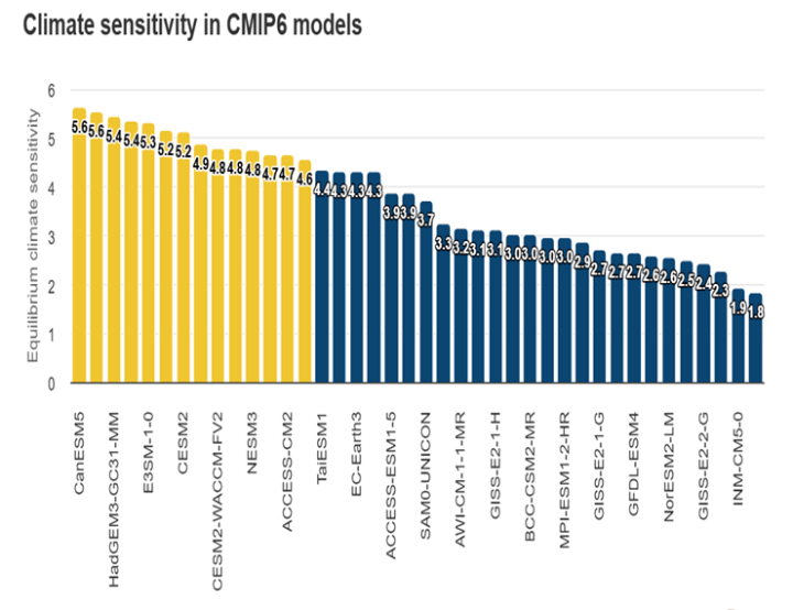 Source: Hausfather (2019). Yellow bars show CMIP6 models with higher sensitivity than any CMIP5 model. Blue bars show CMIP6 model sensitivities within the CMIP5 range.