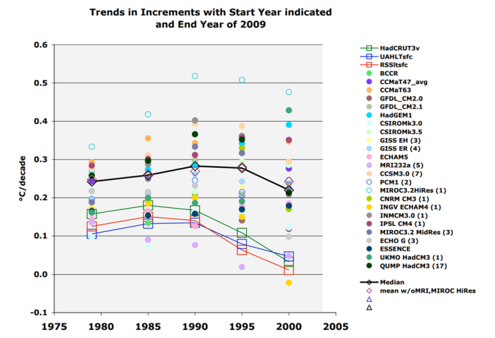 The IPCC’s 2007 AR4 was a key scientific basis for the Endangerment Finding. The most critical input to AR4 was the CMIP3 model ensemble. In the 2000s, it was still difficult to obtain tropospheric temperature projections from climate modelers. Christy, however, was able to obtain surface temperature projections from the models. He then compared those to the UK Climate Research Centre (HadCRUT) surface record and satellite data adjusted to match surface temperatures. In the chart below, temperature trends start in the year indicated on the X-axis and end in 2009. The observations (squares) all fall much below the AR4 model average (diamonds), usually about half the magnitude of the modeled trend.