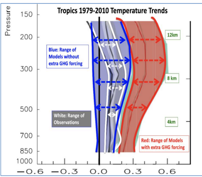 As DOE report authors McKitrick and Christy explain in a peer-reviewed study published in Earth and Space Science, the tropical mid-troposphere is uniquely suited for testing the validity of climate models. That is because: (1) Nearly all models predict strong positive feedbacks (accelerated warming) in the tropical mid-troposphere; (2) the region is well-monitored by satellites and weather balloons; (3) the mid-troposphere is too distant from the surface to be influenced by land use changes; and (4) the models were not previously “tuned” to match the historical climatology in that region, hence are genuinely independent of the data used to test them.