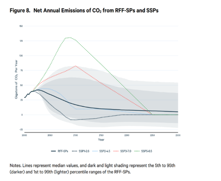 In 2022, Resources for the Future (RFF) published updated baseline emission scenarios, informed by IEA and other market forecasts. In the RFF’s baseline projection, global CO2 emissions are about half those projected in SSP5-8.5 in 2050 and less than one-fifth those projected in 2100. The EPA adopted the RFF baselines as the best available for its November 2023 report on the social cost of greenhouse gases.