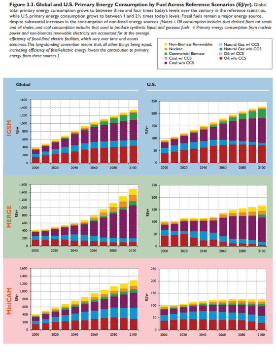 The chart below shows the CCSP energy market projections. The purple segments depict the projected market shares of coal without carbon capture and storage (CCS). In each of the six panels, coal without CCS increases to become either the dominant component of the US and global energy mix or the largest single component. “No one believes that anymore,” Pielke, Jr. comments.
