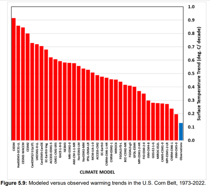 The DOE report shows that, for a critically important climatic region in the US, 36 climate models used in AR6 hindcast significantly more warming than observed, with 30 models projecting two to eight times more warming than occurred during 1973-2022.