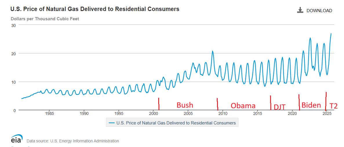 The graph shows two increases. The first occurred under Obama and the second under Biden. Trump’s energy policies are sure to bring the price down again, but it will take time. The mad, destructive energy policies of Obama and Biden will take time to undo.