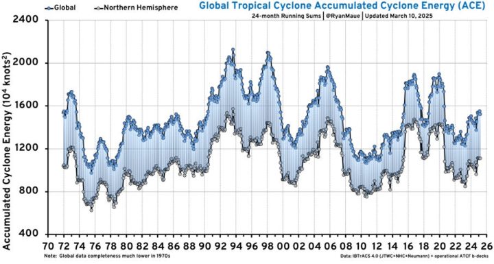 Total annual global ACE (which integrates frequency and intensity) 1970 to March 10, 2025. Source: Ryan Maue.