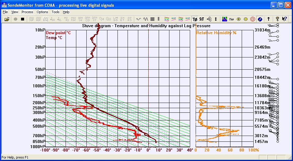 Copying live weather balloon ‘data’ from a Vaisala RS41 Radiosonde this morning – notice the moist nose at about 250 hP level.