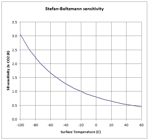 Finally, this is a maximum sensitivity which does not include the various emergent thermoregulatory mechanisms that tend to oppose any heating or cooling. This means the actual sensitivity is lower than ~1.1°C per 2xCO2.