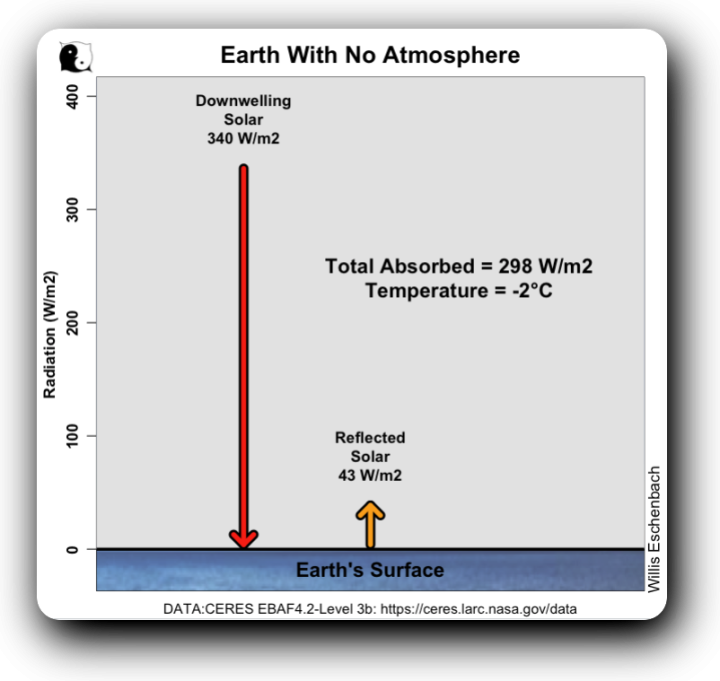 “Here’s a thought experiment. Consider the Earth with no atmosphere and with the same surface albedo of 12.5% that it has now. How warm would it be?”