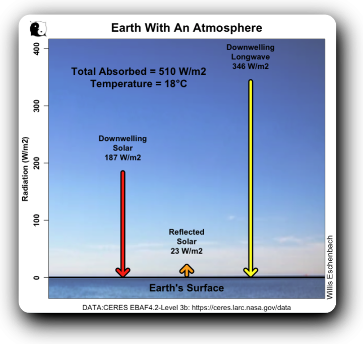 Figure 2. Total surface radiation absorption, Earth with an atmosphere. This 510 W/m2 is all the power absorbed by the surface. (Yeah, yeah, I know there’s geothermal heat. It’s on the order of tenths of one W/m2, so it’s always ignored for this level of analysis.) The yellow/black arrow is the downwelling longwave (thermal) radiation from the atmosphere to the surface.