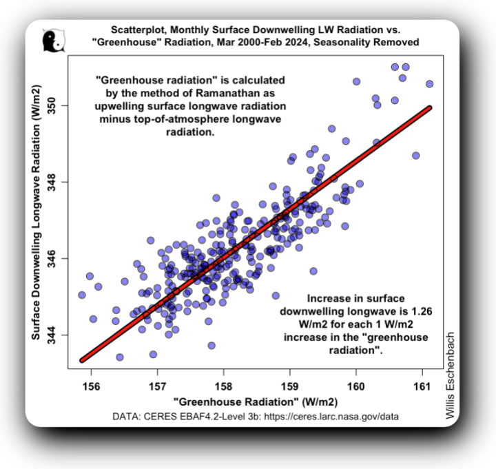 When we look at the current global correlation between the poorly-named atmospheric “greenhouse radiation” measured at the top of the atmosphere (TOA) and the surface downwelling longwave radiation, when the TOA-measured greenhouse radiation changes by 1 W/m2, due to internal feedbacks, the surface downwelling longwave radiation changes by 1.26 W/m2. Or vice versa. In either case, they move in synchrony.
