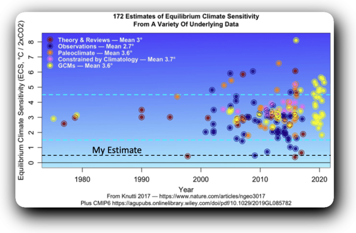 Figure 4. A large number of different estimates of the equilibrium climate sensitivity over the last half century, coded by color. Pale blue lines show the IPCC uncertainty values. My estimate of a half-degree per doubling is shown by the horizontal dotted black line.